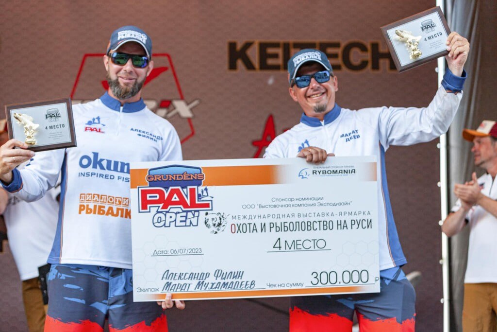 Команда Александра Филина и Марата Деева отличалась своим профессионализмом и спокойствием. Несмотря на то, что ребята не являются опытными спортсменами, они с первого дня вошли в пятерку лидеров. Без лишней суеты и спешки, размеренно и четко с юмором, экипаж закрывал каждый тур. Команда была оснащена передовыми снастями от фирмы Okuma, что позволило им вытягивать крупные экземпляры рыбы до 3 кг.